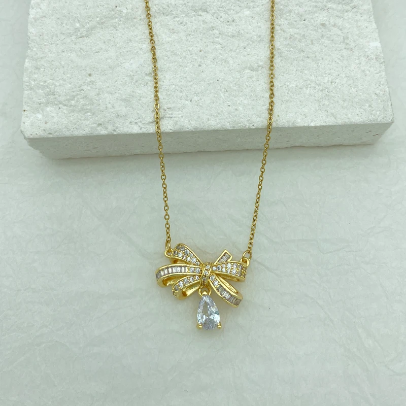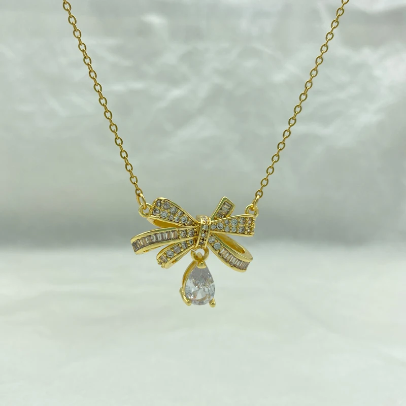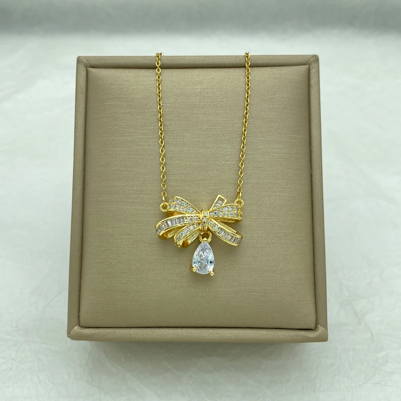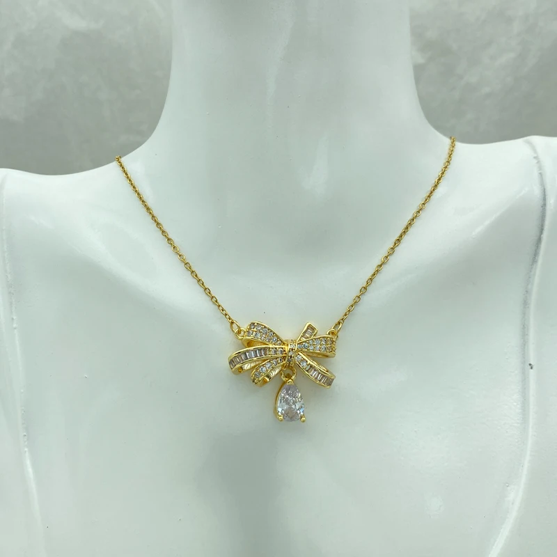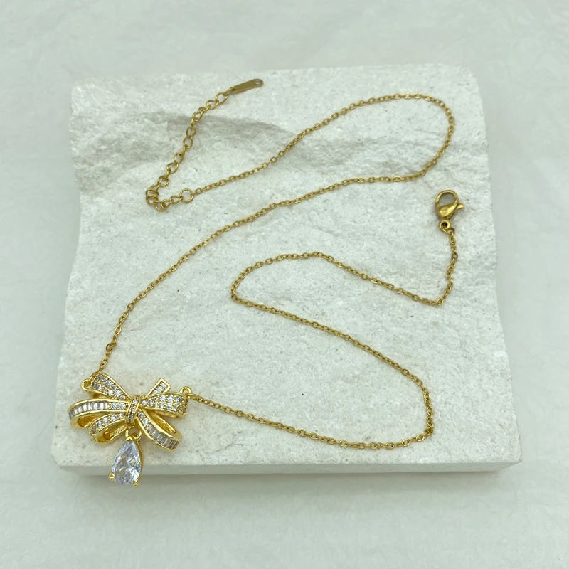 Gold Plated Big Bowknot With A Water Drop Stainless Steel Necklaces New In Fashion Jewelry Cute Style Luxury Design