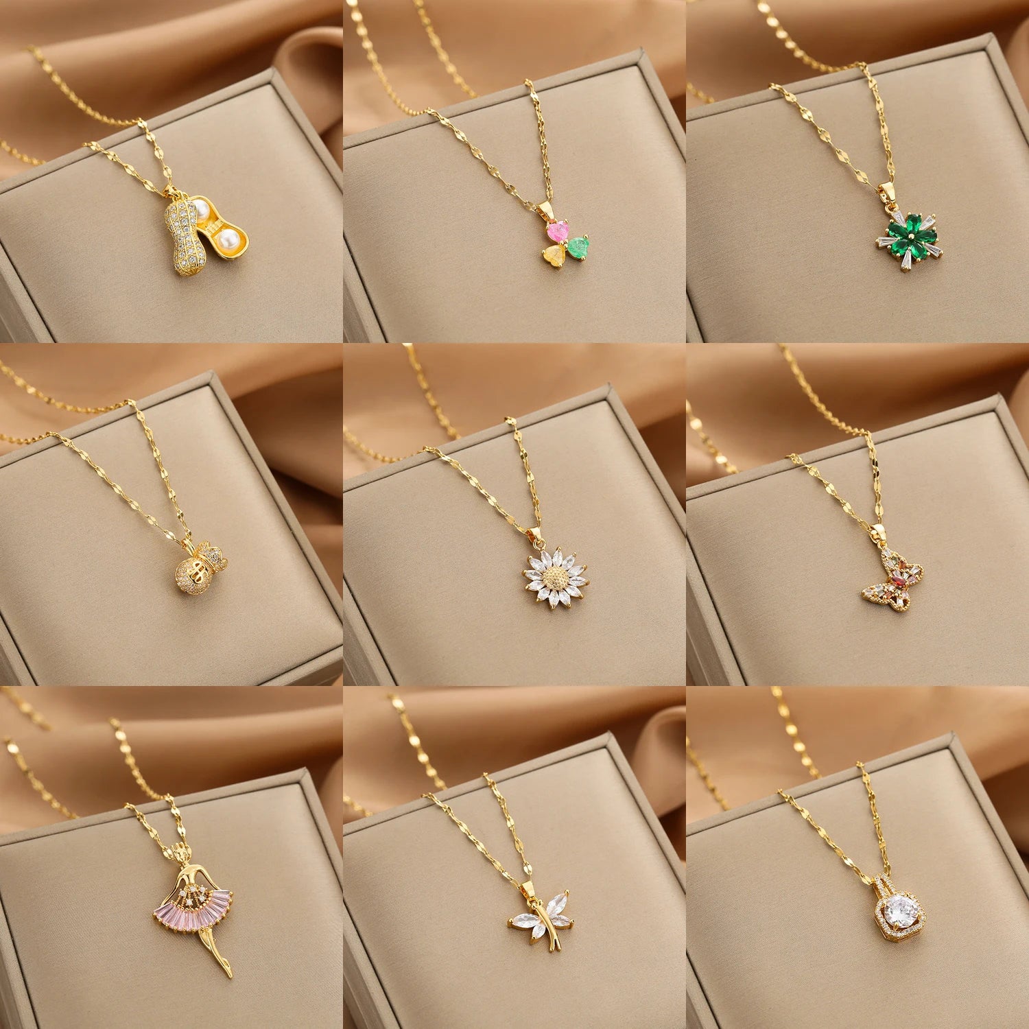 Gold Color Necklace for Women Zircon Jewelry Pendant Necklace Stainles Steel Mermaid Heart Butterfly Stainless Steel Sunflower