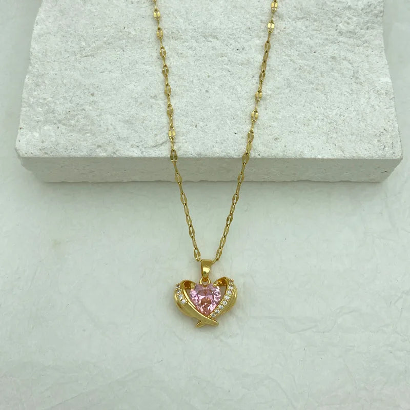Pink Zircon Heart Pendant Necklace For Women With Gold Plated Stainless Steel Fashion Jewelry